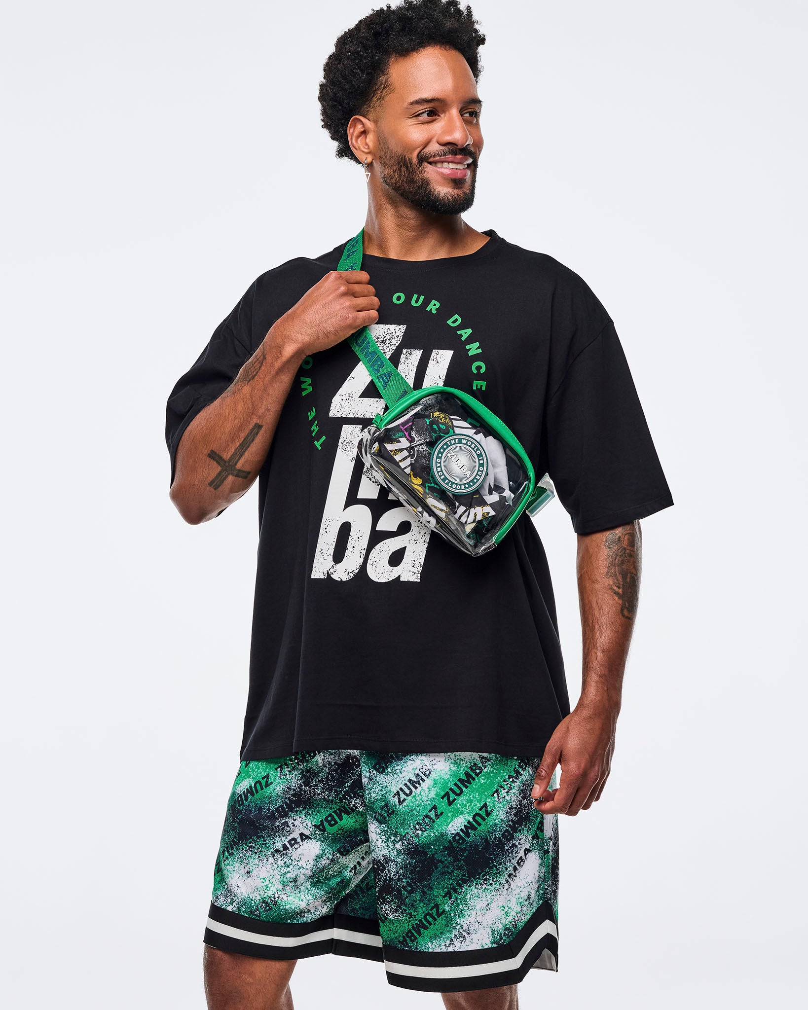 These men's slouch sweatpants feature a 28" inseam and a relaxed silhouette with men's sizing. Designed with an encased elastic waistband and functional drawcord, side seam pockets, and elasticized bottom cuffs. The oversized Zumba print on the leg adds a bold touch to the oversized fit and long-length design for comfortable everyday wear.