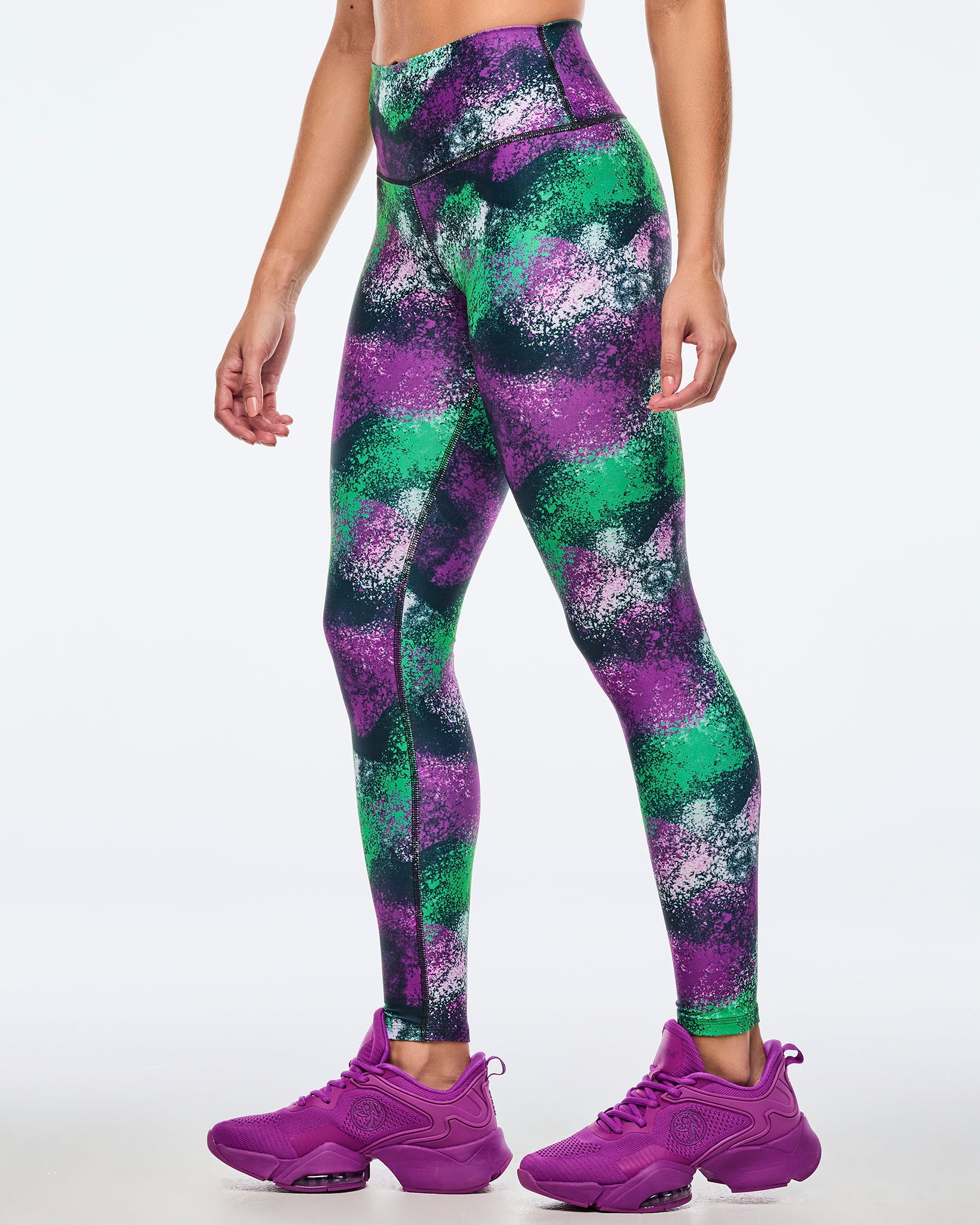 This green and purple racerback bra features a V-neck design with an encased elastic band beneath the bust for secure support. Showcasing a Zumba-exclusive all-over print, it offers a slim fit and cropped length for a stylish and comfortable workout essential.