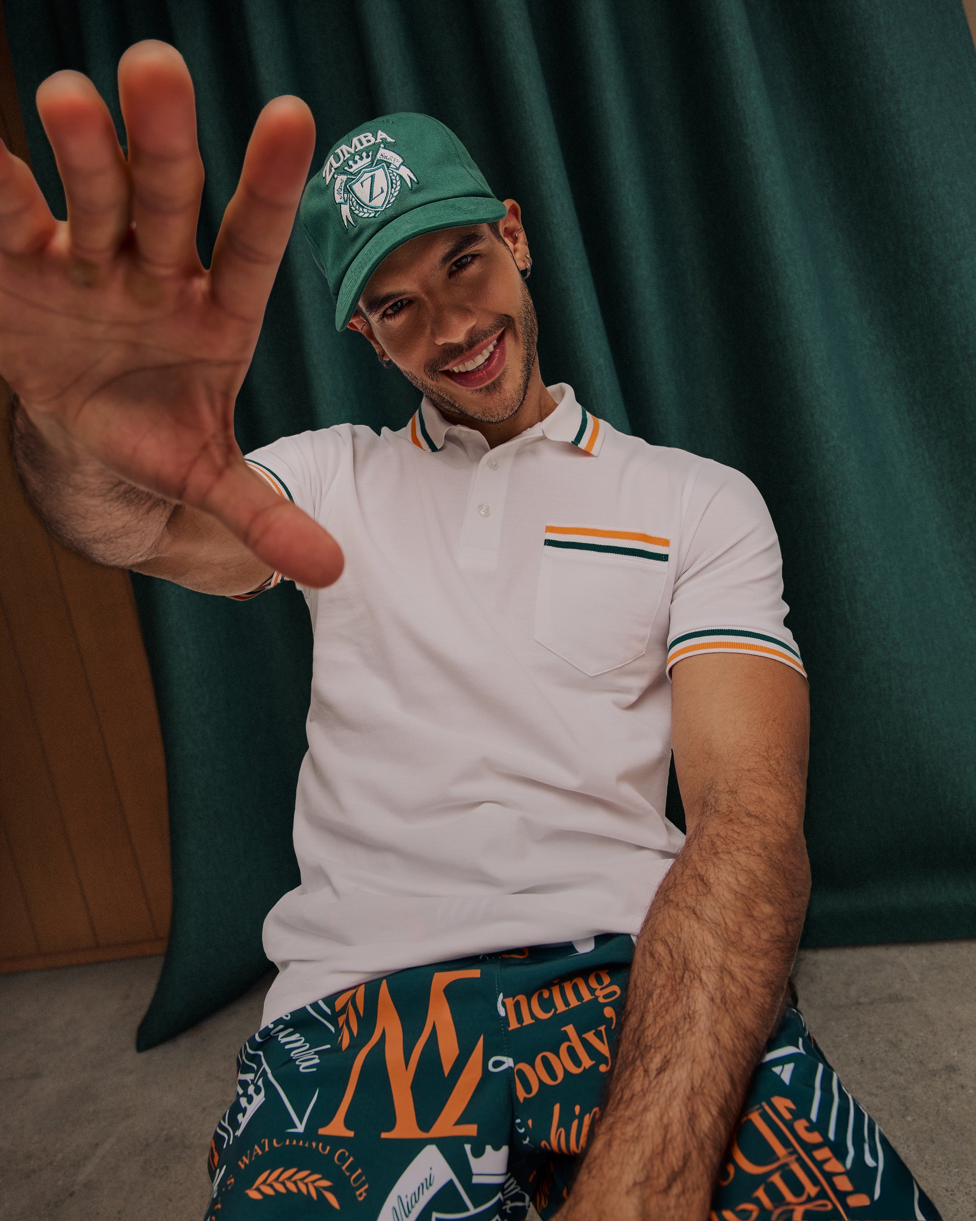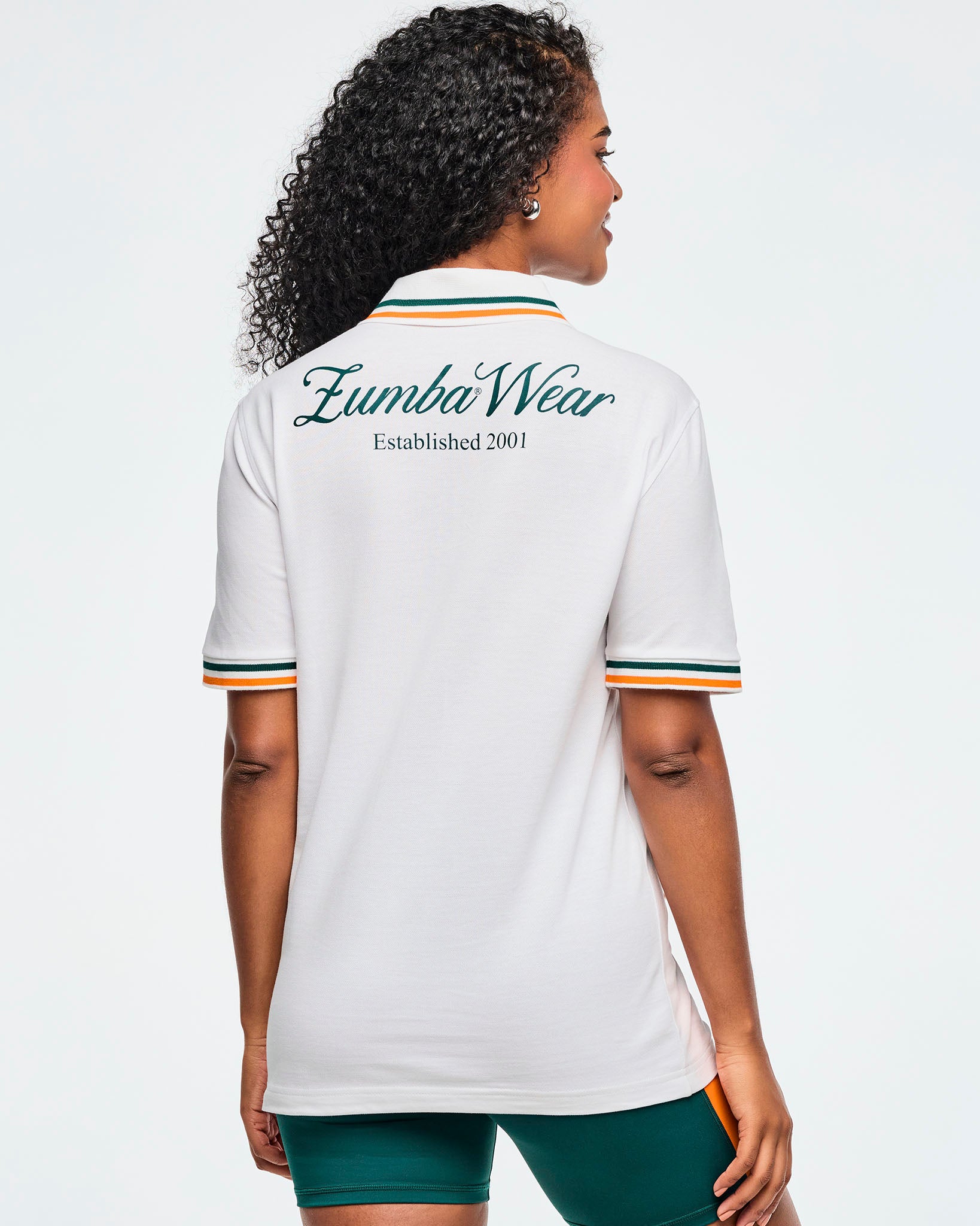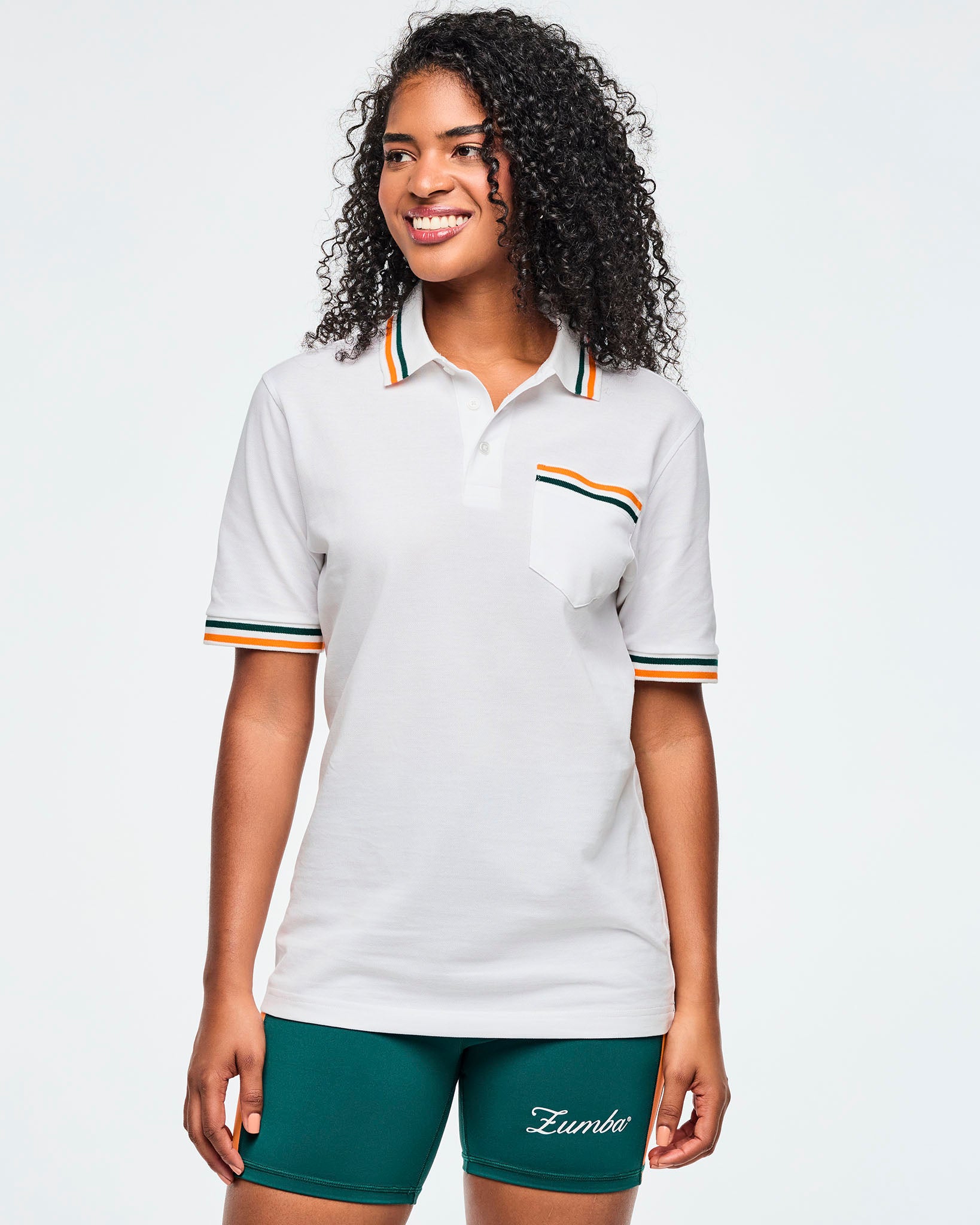 Experience comfort and style with this men's polo featuring a pique knit collar and a practical front button placket. It showcases striped flat knit cuffs alongside a detailed pocket trim, enhanced by a unique Zumba graphic on the back. Designed for an easy fit and extended length, this polo is perfect for a polished, casual look.